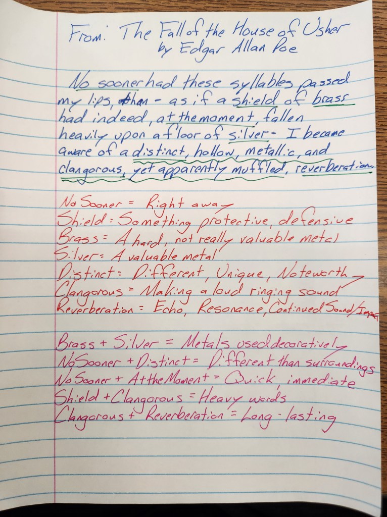 In this moment, the narrator begins to realize how corrupt Roderick Usher is, and begins to distance himself from his friend. Poe contrasts words that suggest quickness (“No sooner,” “at the moment,”) with words that connote a longer echoing (“clangorous,” “reverberation”) to suggest that the tone of the moment has changed, and that the narrator is learning about something long-lasting. He reinforces this echoing by shifting from a quicker sentence at the start of the scene to a longer description that carries a list of five adjectives to describe the reverberation. Poe suggests the tone grows ominous through the use of words that imply heaviness, like “shield” and “clangorous,” and provides a series of words that suggest contrast; “at the moment” makes the sound appear sudden, and he describes the metallic sound using two metals of contrasting color and value.